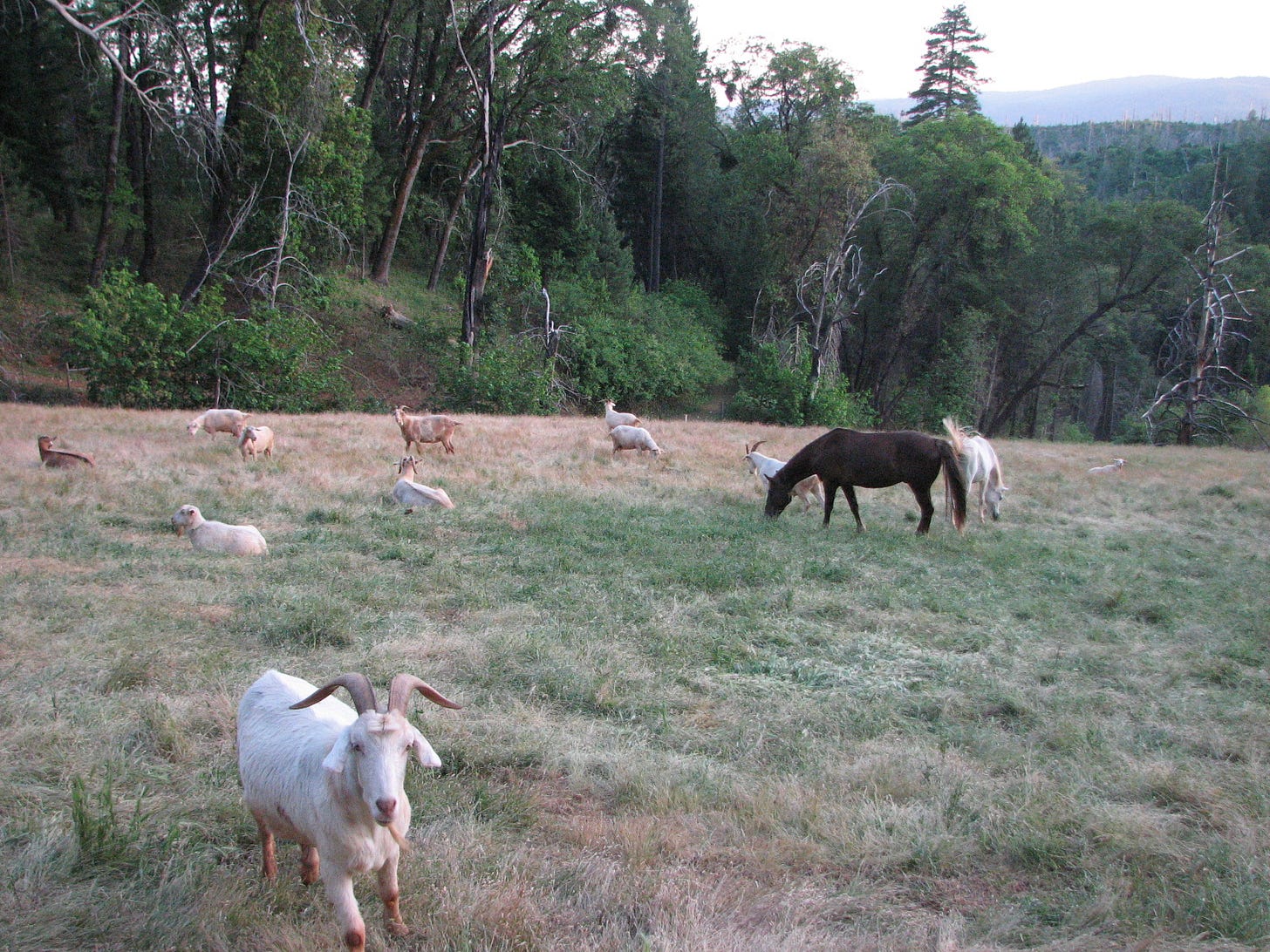Two days later, Justin, one of our guardian dogs, went missing. For five years, Justin and his partner Juneau had guarded the small herd of goats from the mountain lions and bears that live in these Sierra Nevada foothills. He was Akbash, an old breed from eastern Turkey. Reserved and independent, he was gentle with people but fierce in protecting his flock. Justin looked like a giant white Labrador Retriever, whereas Juneau was a long-haired, thick coated Great Pyrenee, originally from the cold, high mountains straddling France and Spain. She was devoted to Justin. He had looked after her since my partner, Teresa, and I brought Juneau home as an inexperienced pup.